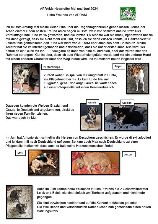 Newsletter Mai/JuniBeitrags-Autor:Fredi BuehrerBeitrag veröffentlicht:16. Juli 2024Beitrags-Kategorie:Neuigkeit Das könnte dir auch gefallen APRAM-NEWSLETTER / Januar 2021 6. Februar 2021 Laica wurde zum Notfellchen 24. Oktober 2024 Tom, seit 3 Wochen bei seiner Pflegefamilie! Das gibt es zu berichten: 7. Januar 2022 Wir suchen händeringend nach Flugpaten 9. Juni 2020 Das ist Rafael,ein junger Kater (1,5 Jahre) und……. 3. Dezember 2023 CLARA MACHT FORTSCHRITTE 16. April 2020